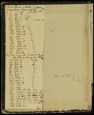 175 ursprünglich fest eingebundene Seiten mit vielen kleinen Zetteln dazwischen, zwischen S. 73 und 74 noch eine Anzahl von losen Seiten, auf die sich wiederum kleinere Zettel beziehen. Viele dieser losen Blätter konnten den Hauptseiten zugeordnet werden, jene, die nicht eindeutig zuzuordnen waren, sind vor S. 74 eingeordnet worden. Auch im übrigen Buch wurde versucht, lose Blätter den eingebundenen Seiten zuzuordnen. Wo dies nicht möglich war, wurden die Blätter am vorgefundenen Ort belassen. Nicht digitalisiert wurden die Fragmente S. 105b und 125b sowie die Leerseiten S. 173-175.