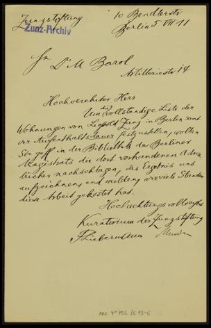 Bitte um Erstellung einer Liste aller Adressen von Leopold Zunz [0,16 mb]
