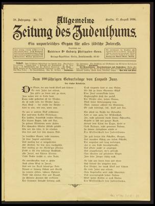 Allgemeine Zeitung des Judenthums. Ein unparteiisches Organ für alles jüdische Interesse, Berlin, 17.8.1894, S. 385-390; Der Gemeindebote. Beilage zur "Allgemeinen Zeitung des Judenthums", 17.8.1894.